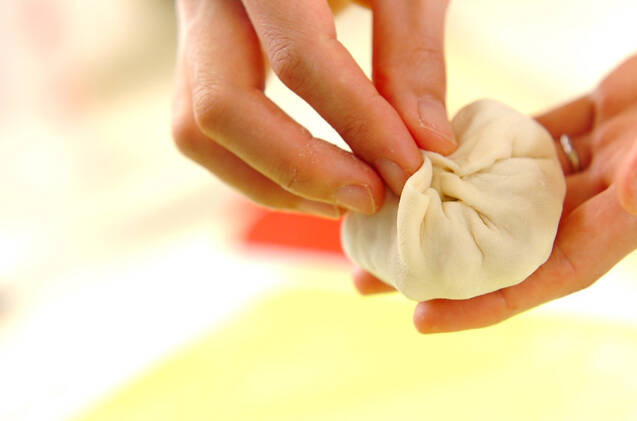 台に強力粉を振って<生地>を出し、8等分にして丸める。めん棒で10cmの円に伸ばす。<みそあん>を中心にのせて、周囲の生地をしっかりとつまんで閉じる。
