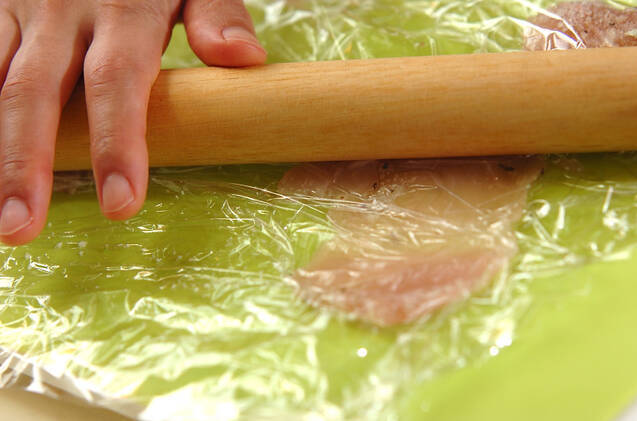 (1)の上にラップをのせて、3~4倍の大きさになるまで麺棒でのばす。ラップを外して、両面に片栗粉をまぶす。