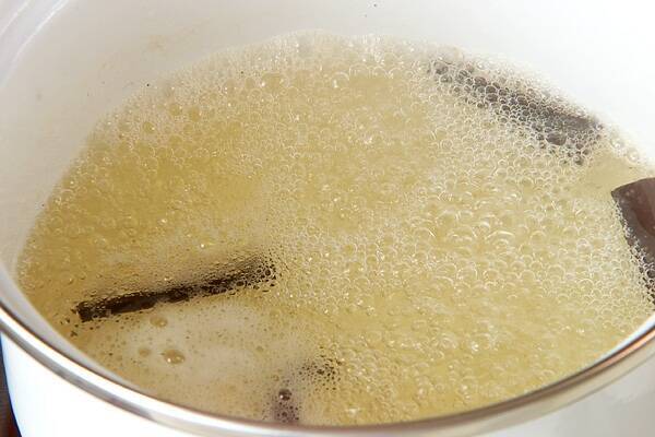 ホウロウ又はステンレスの鍋に、グラニュー糖、ハチミツ、レモン汁、バニラビーンズ、水、白ワインを入れて強火にかける。