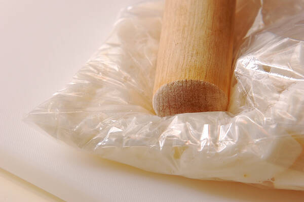 長芋をザク切りにし抗菌のビニール袋に入れ麺棒などでたたき細かくつぶす。