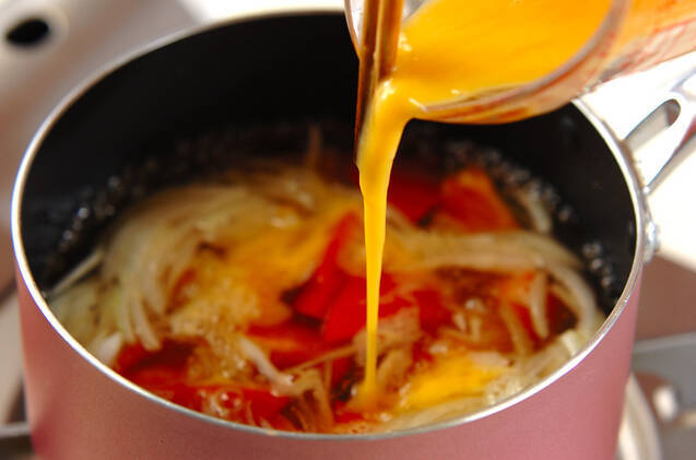 再び煮たったら溶き卵を加え、菜ばしで円を描くように大きく混ぜ合わせ、卵がふんわり浮かんだらワカメを加え、火を止める。器によそい、コショウを振る。