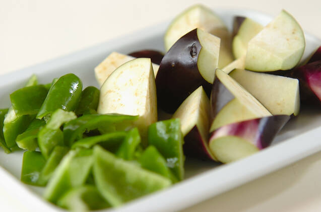 ナスはガクを切り落とし、ピーマンは縦半分に切ってヘタと種を取り、それぞれ乱切りにする。