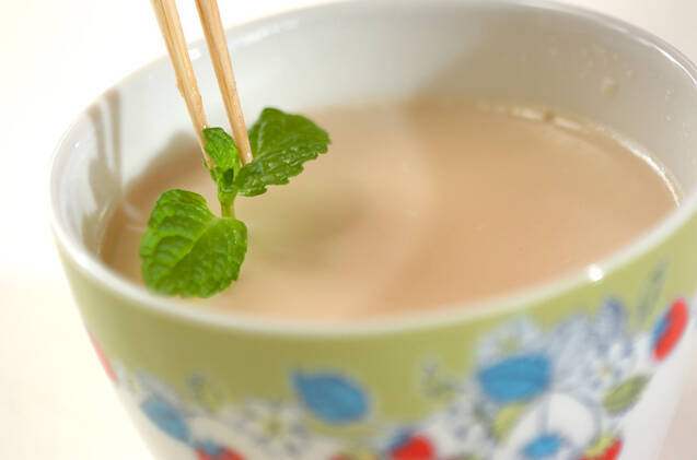 (2)に(1)を加えて混ぜ合わせ、水でぬらした器に流し入れて冷蔵庫で冷やしかためる。かたまったら、ミントの葉を添える。