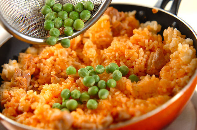 きれいなフライパンにサラダ油少々と半量のバターを中火にかけ、バターが溶けたらご飯を加えて強火にし、全体に炒める。(1)の具を戻して炒め合わせ、エンドウ豆を加えてひと混ぜし、火を止める。