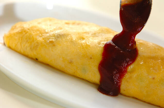 キッチンペーパーをオムライスにかぶせ、手で押さえながら包むように形を整え、混ぜ合わせた<ソース>をかける。同様に人数分作る。
