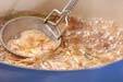 煮込み鍋に固形スープの素、ローリエ、ショウガ、水を加え、煮立ったらアクを取り、鍋の蓋をして弱火で約20分煮込む。