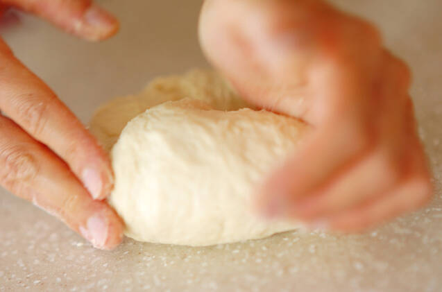 ゴムベラで混ぜ、少し粉気が残っているくらいで台に取り出し、力を入れて10分ほどこねる。全体がなめらかになったら、表面を張らせるように生地を丸める。