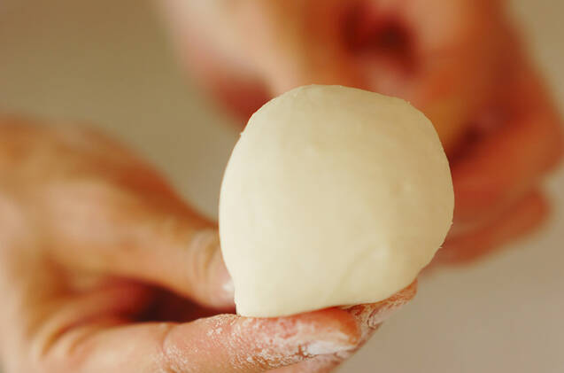 カードで5等分に分割し、表面を張らせるように生地を丸め、とじ目を下にする。固く絞った布巾をかぶせて、室温で15分ほど休ませる。