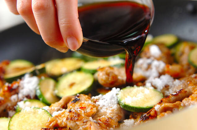 ズッキーニに火が通ったら、<調味料>の材料を加えて炒め合わせる。トロミがついたら、器に盛る。