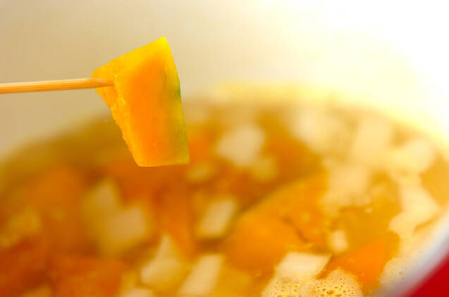 鍋にカボチャ、水、固形チキンスープの素を入れて強火にかけ、煮立ったら玉ネギを加える。再び煮立ったら中火にし、カボチャに竹串がスッと刺さるくらいまで煮る。