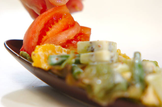 食べる直前に器にサニーレタスを広げ、オレンジ、キウイ、サヤインゲンを<ドレッシング>で和えて器に盛り合わせ、トマトを添える。