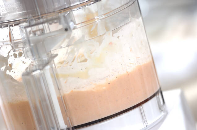 <スモークサーモンのディップ>の材料を全てフードプロセッサーに入れて撹拌し、取り出す。