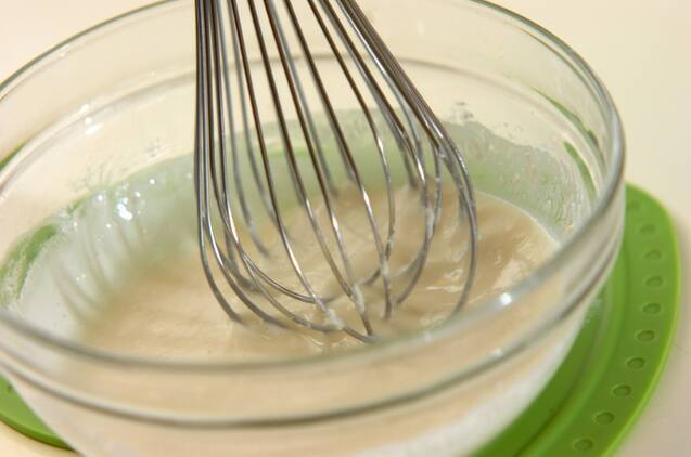 ボウルに小麦粉と水を入れて、だまがなくなるように混ぜる。砂糖、塩、ニラを加え混ぜ合わせる。