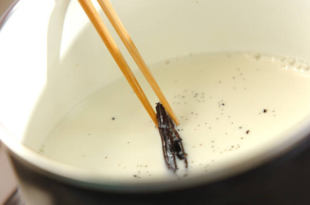 鍋に牛乳、グラニュー糖、バニラビーンズ(サヤごと)を入れて火にかける。沸騰させないように注意しながら、グラニュー糖を煮溶かして火を止める。