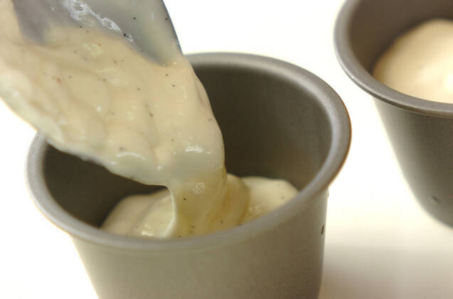 ボウルを氷水にあて、トロミがつくまでゴムベラ等で混ぜ合わせ、アーモンドエッセンスを加えてひと混ぜし、内面を水でぬらしたプリン型に流し入れる。ラップをかけて冷蔵庫で1時間位冷やしかため、かたまったら器に返し、ミントの葉を添える。