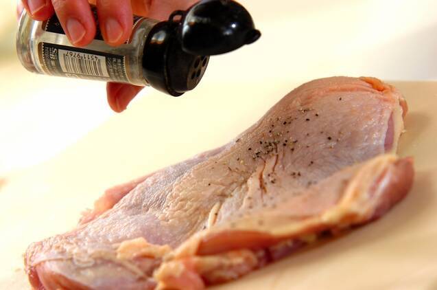 鶏もも肉の両面に塩と粗びき黒コショウを振る。レモンをくし切りにする。