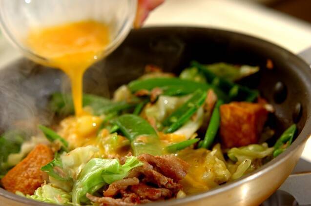サッと炒め合わせて、ツナ缶と厚揚げを加えて大きく混ぜる。溶き卵を回し入れて、厚揚げを崩さないようにひと混ぜする。