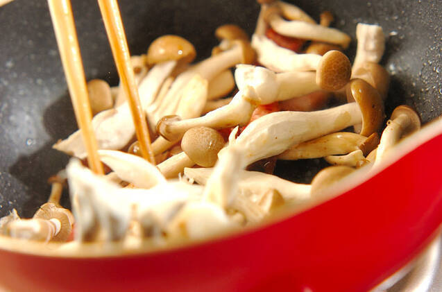 フライパンにオリーブ油とベーコンを入れて中火にかけ、ベーコンから脂が出ればシメジを加えて炒め、塩コショウをする。