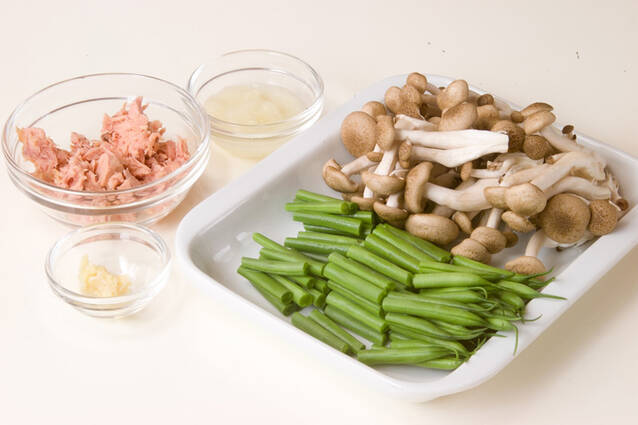 サヤインゲンは軸を少し切り落とし、2~3等分の長さに切る。