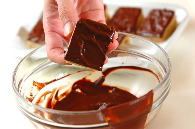 バウムクーヘンに(1)のチョコレートを適量つけ、オーブンペーパーの上にのせる。お好みのトッピングを飾って冷蔵庫で冷やし、器に盛る。(ヒント)調理時間に冷蔵庫で冷やす時間は含みません。