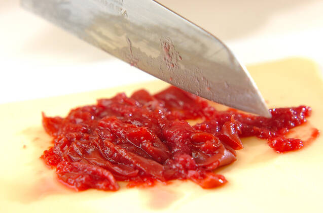 エノキは石づきを切り落とし、長さ2cmに切る。梅干しは種を取り、たたく。