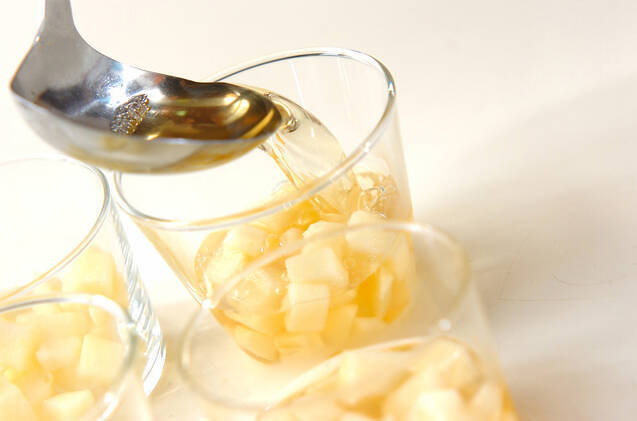 鍋底を氷水に当て、混ぜながらトロミがつくまで冷やし、リンゴを入れた容器に流し入れる。