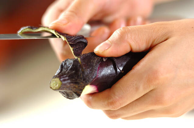 ナスはガクの部分に1周浅く切り込みを入れてガクを外し、すりこ木等で軽く叩いておく。