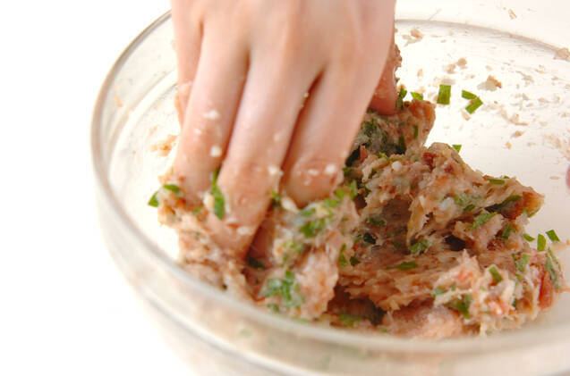 ボウルに鶏ひき肉、白ネギ、ショウガ、溶き卵を入れ、粘りが出るまで手でよく混ぜ合わせる。梅干し、かつお節、大葉も加えよく混ぜ合わせる。