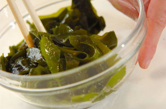 ワカメは水洗いし、水気を絞って食べやすい長さに切り、<下味>の材料をからめる。