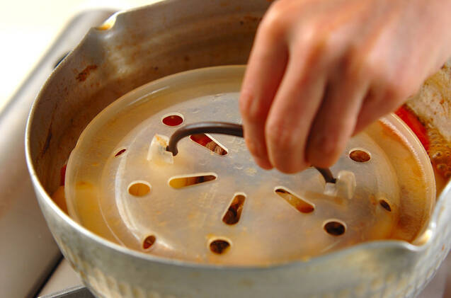 煮たったら中火にし、アクを取りながら9~10分煮る。ジャガイモに竹串が少し刺さる位になったら、<合わせ調味料>を加え、落とし蓋をして10~12分煮る。汁気が少なくなったら器に盛る。