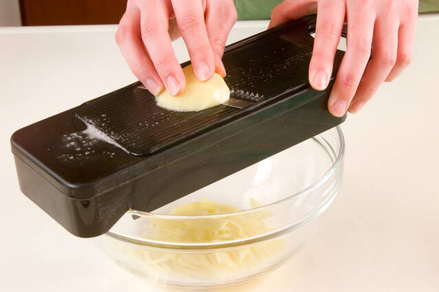 ジャガイモは皮をむき、せん切りにする。スライサーを使うと便利です。