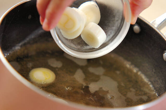 鍋にだし汁を入れて中火で熱し、白ネギを加える。