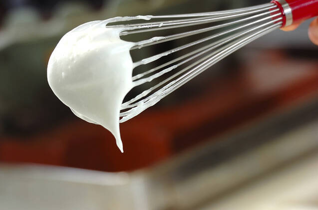 クリームチーズは耐熱ボウルに入れ、電子レンジで10秒ずつ加熱して柔らかくする。電子レンジは600Wを使用しています。卵白は別のボウルに入れて泡立てる。ふんわりしてきたら砂糖10gを2回に分けて加え、しっかりしたメレンゲを作る。