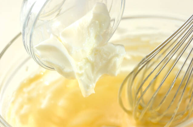 クリームチーズに砂糖20g、卵黄、レモン汁、プレーンヨーグルトを順に加え、その都度泡立て器でしっかり混ぜる。