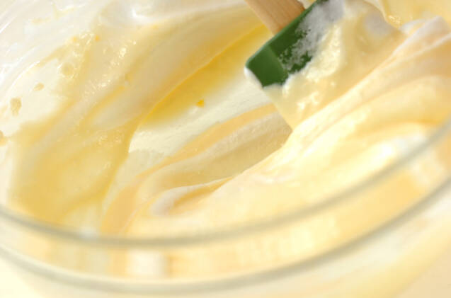 (1)のメレンゲを(2)に加え、ふんわりと混ぜ合わせてグラスに分け入れ、冷蔵庫で冷やしかためる。(ヒント)調理時簡に冷やしかためる時間は含みません。
