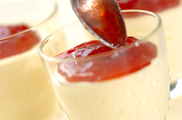 <イチゴソース>のイチゴジャムは粒が大きい場合は包丁で刻み、水でソース状にのばしてムースにかける。