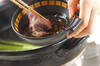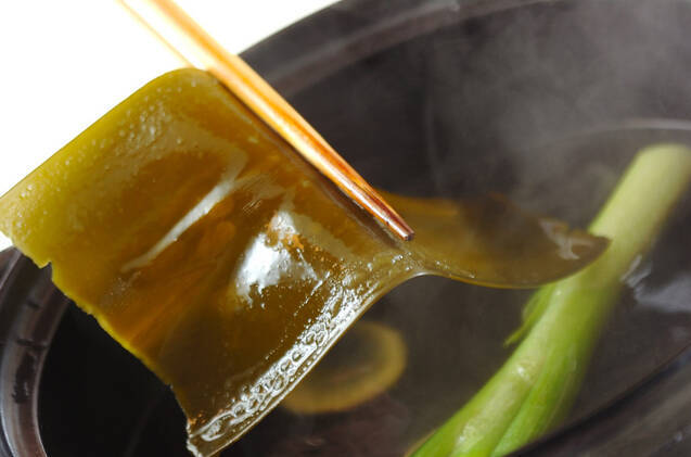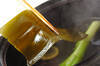 土鍋に<スープ>の材料を入れて強火にかけ、沸騰直前に昆布を取り出す。