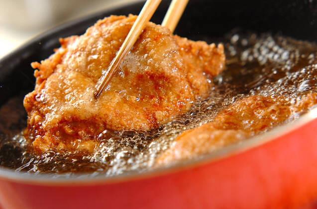 汁気をきった鶏もも肉に片栗粉をまぶし、170℃の揚げ油でサクッと色よく揚げ、食べやすい大きさに切る。