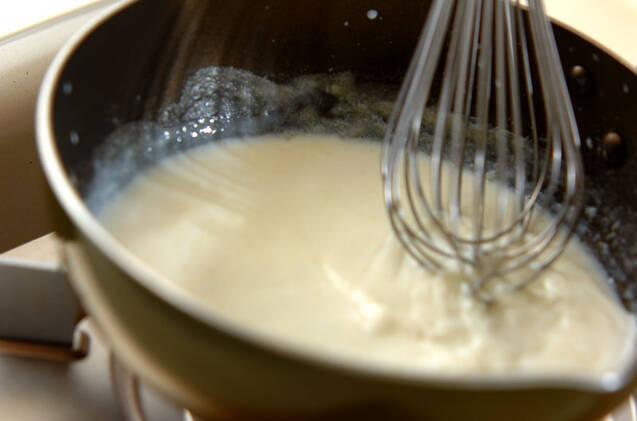 フツフツ泡が出てきたら、牛乳を一気に加えて泡立て器でダマがないように手早く混ぜ合わせる。