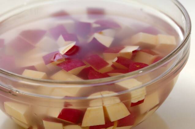 サツマイモは皮ごとタワシで水洗いし、1.5cm角に切って分量外の塩水に放つ。