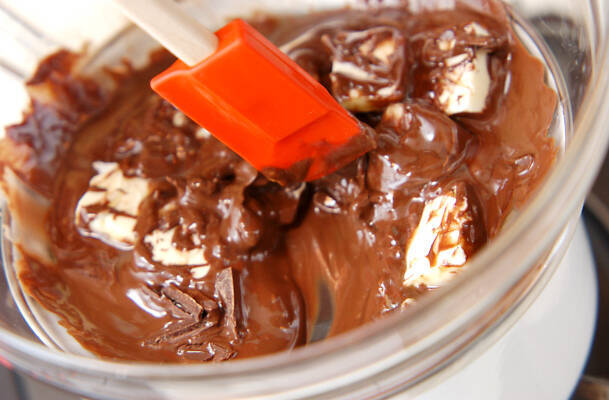チョコレート液を作る。ボウルに無塩バター、チョコレートを入れ、ボウルより小さい鍋に重ねて湯せんにかけ、ゴムベラなどで混ぜながら溶かす。
