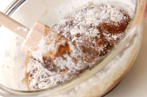 振るっておいた粉類、クルミを加え、ゴムベラで切るように混ぜ合わせる。