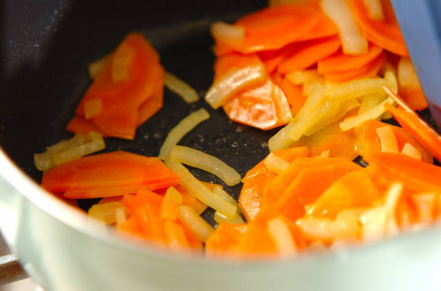鍋にバターを入れて中火にかけ、バターが溶けたらニンジン、玉ネギをしんなりするまで炒める。