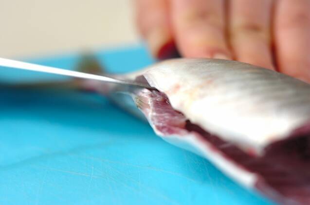 腹の切り込み位置から包丁を中骨まで入れ、尾まで切り込みを入れる。