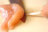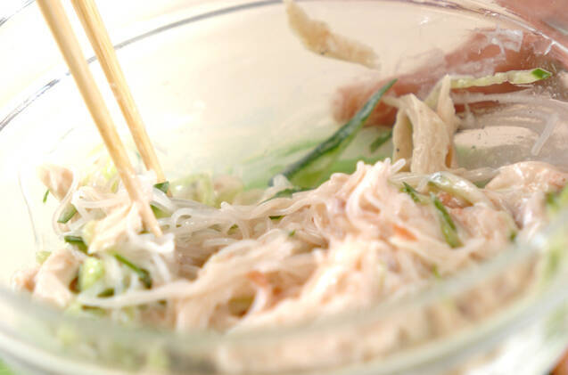 <梅マヨ>のボウルに春雨、鶏ささ身、キュウリを加えて和え、器に盛る。