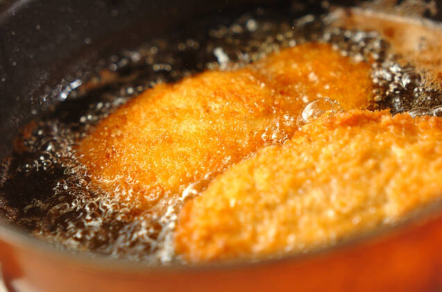 170℃の揚げ油に静かに入れ、ジュワジュワという大きな泡が出ていたのが、シュワシュワと小さな泡になり、おいしそうなキツネ色になったら、油をきる。