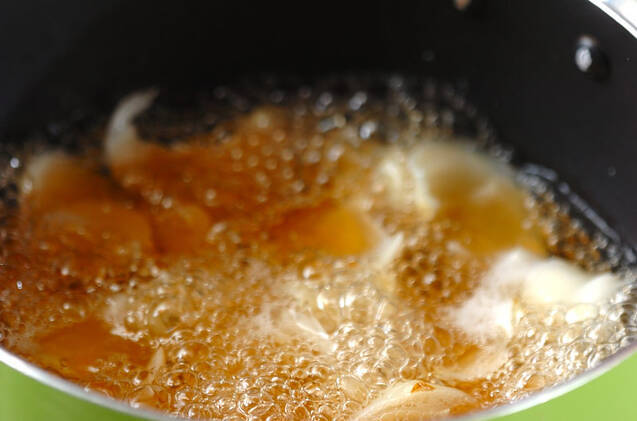 鍋に<合わせだし>を入れて強火にかけ、煮立ったらユリネを加え1〜2分煮て、チリメンジャコ、ワカメを加える。