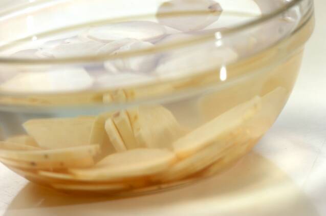 サツマイモは皮をむき、薄切りにしてたっぷりの水に放ち、水気をきる。