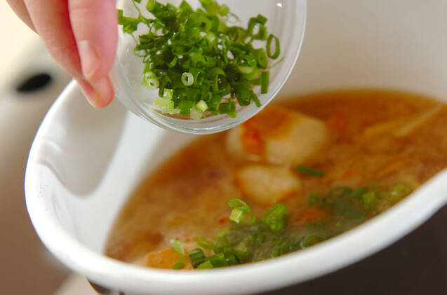 ナメコ、白菜キムチを加え、再び煮たつ直前に火を止め、刻みネギを加えて器に注ぐ。