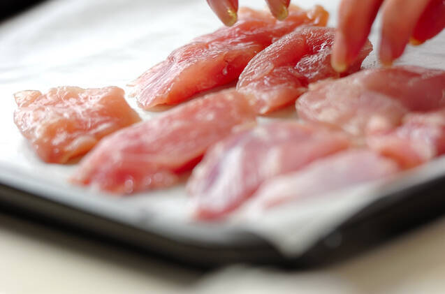 天板にオーブンシートを敷き、ガーゼの間の鶏肉を取り出し、並べる。160 ℃に予熱しておいたオーブンで10~15分焼く。ハケでみりんをぬり、オーブンを250 ℃に上げ、表面に少し焼き色がつくまで焼く。